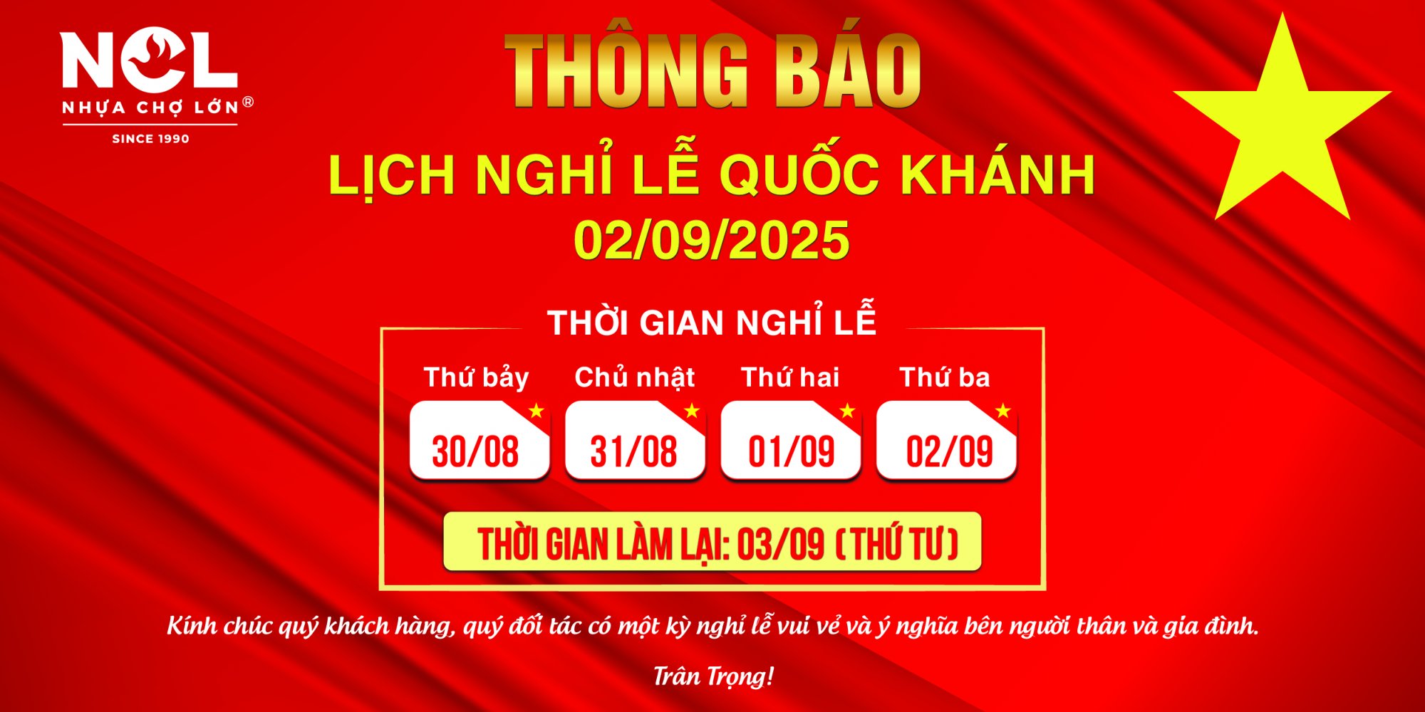 - Thời gian nghỉ lễ: Từ ngày 30/08 - 02/09 (Thứ 7 - Thứ 3)